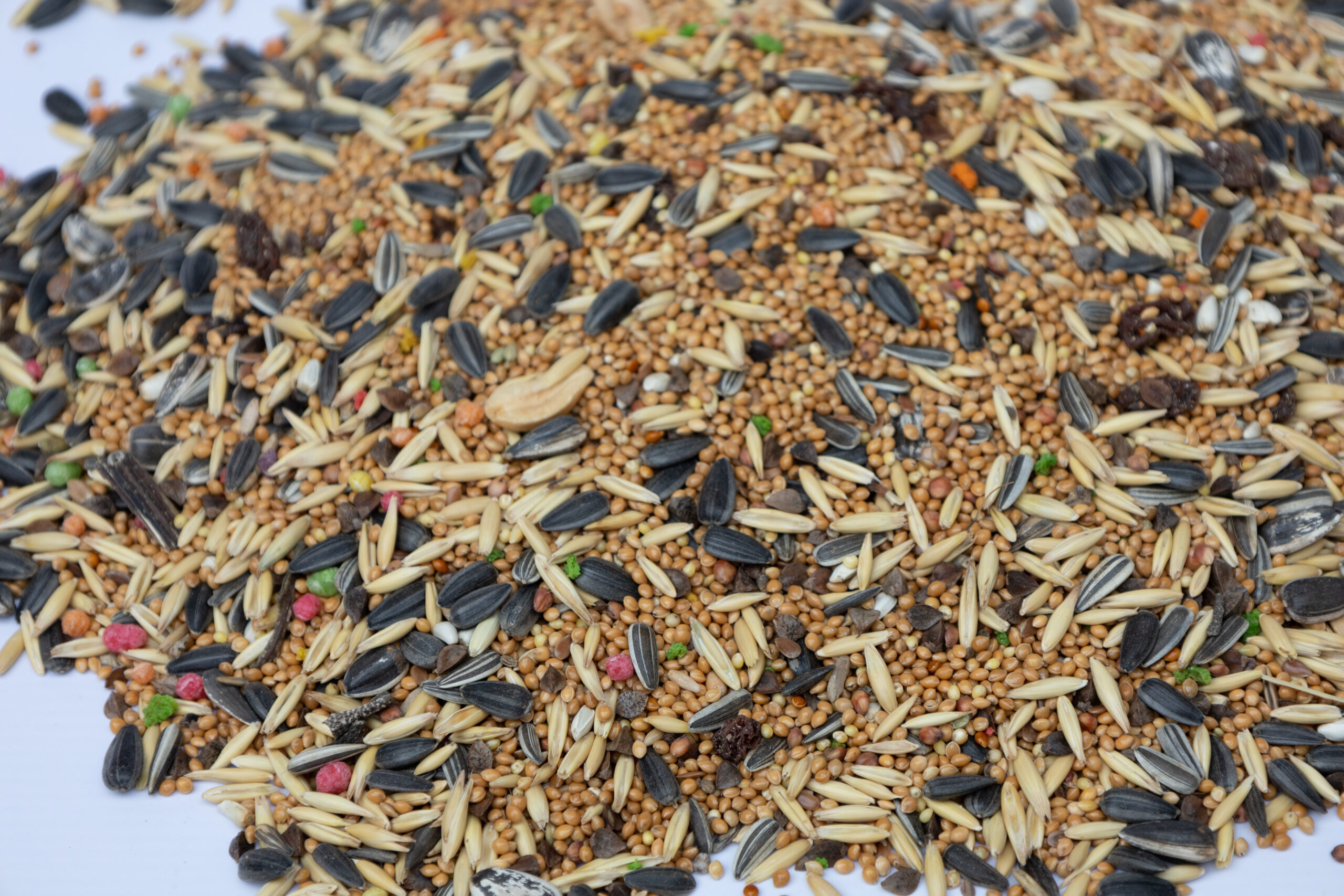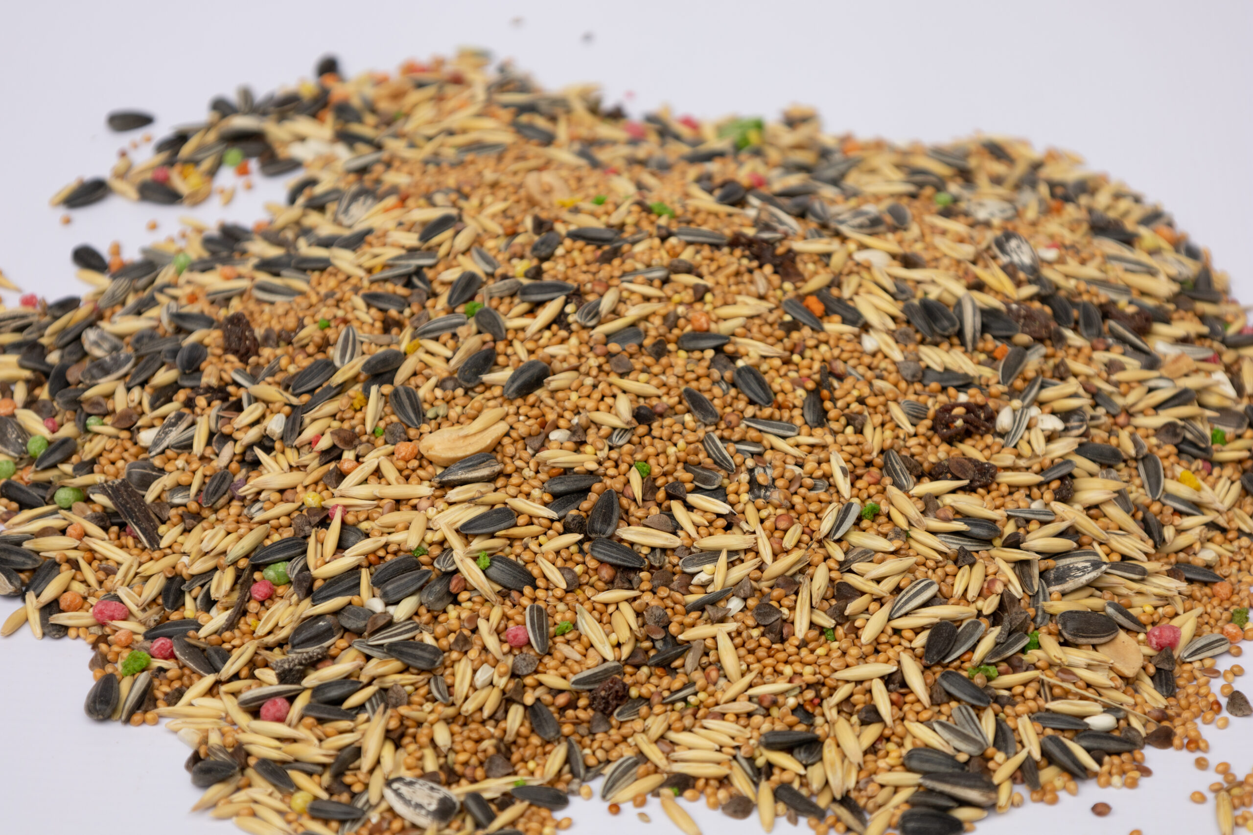 Skład: proso, mieszanka ziaren słonecznika, owies ,kardi, kanar ,len, biszkopt mielony, suszone warzywa, orzechy.
